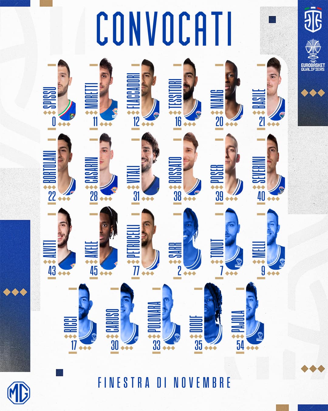 Il Commissario Tecnico della Nazionale italiana Gianmarco Pozzecco ha diramato le convocazioni per la finestra delle gare di qualificazione a Eurobasket 2025 in programma dal 18 al 25 novembre, durante la quale l’Italia sfiderà due volte l’Islanda, in trasferta a Reykjavik il 22 novembre e a Reggio Emilia lunedì 25.