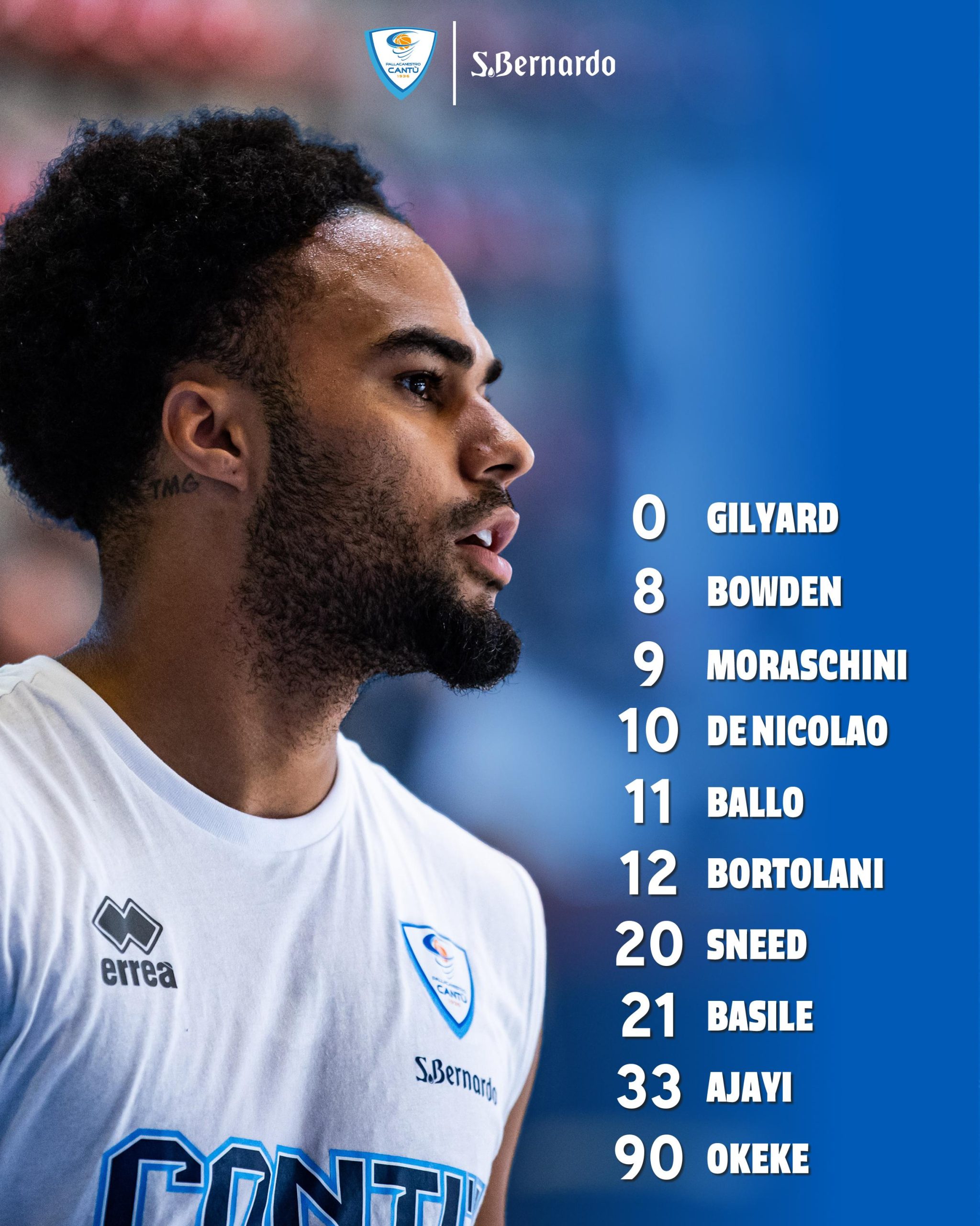 Occasione in cui debutteranno anche i nuovi numeri di maglia, che accompagneranno gli uomini di coach Brienza per tutta la prossima stagione. Si riparte dalle conferme di Riccardo Moraschini, Andrea De Nicolao e Grant Basile, che proseguiranno rispettivamente con 9, 10 e 21 sulla schiena. Cambia invece numero Leonardo Okeke, passando dal 66 al 90.