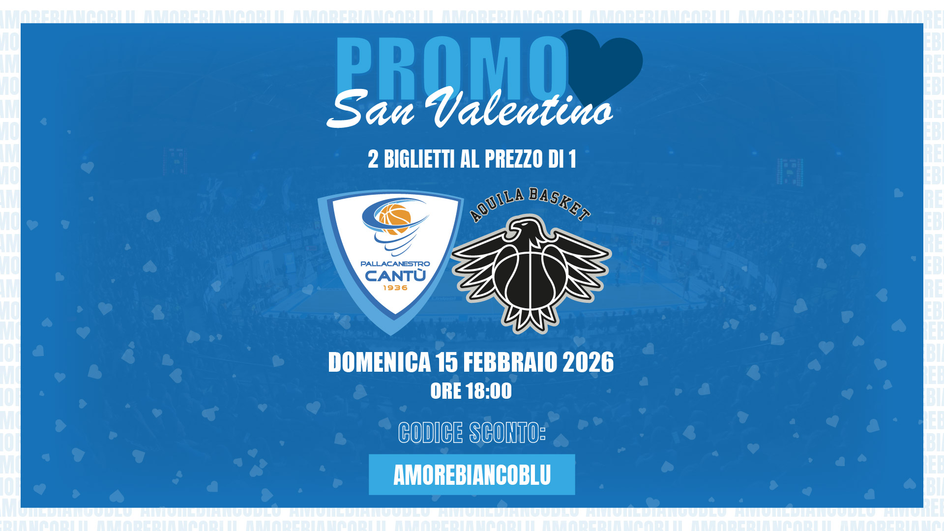 Domenica 15 febbraio l’Acqua S.Bernardo Cantù affronterà alle ore 18:00 la Dolomiti Energia Trentino. Di seguito tutte le informazioni per l’acquisto dei biglietti e per approfittare della speciale Promo San Valentino.