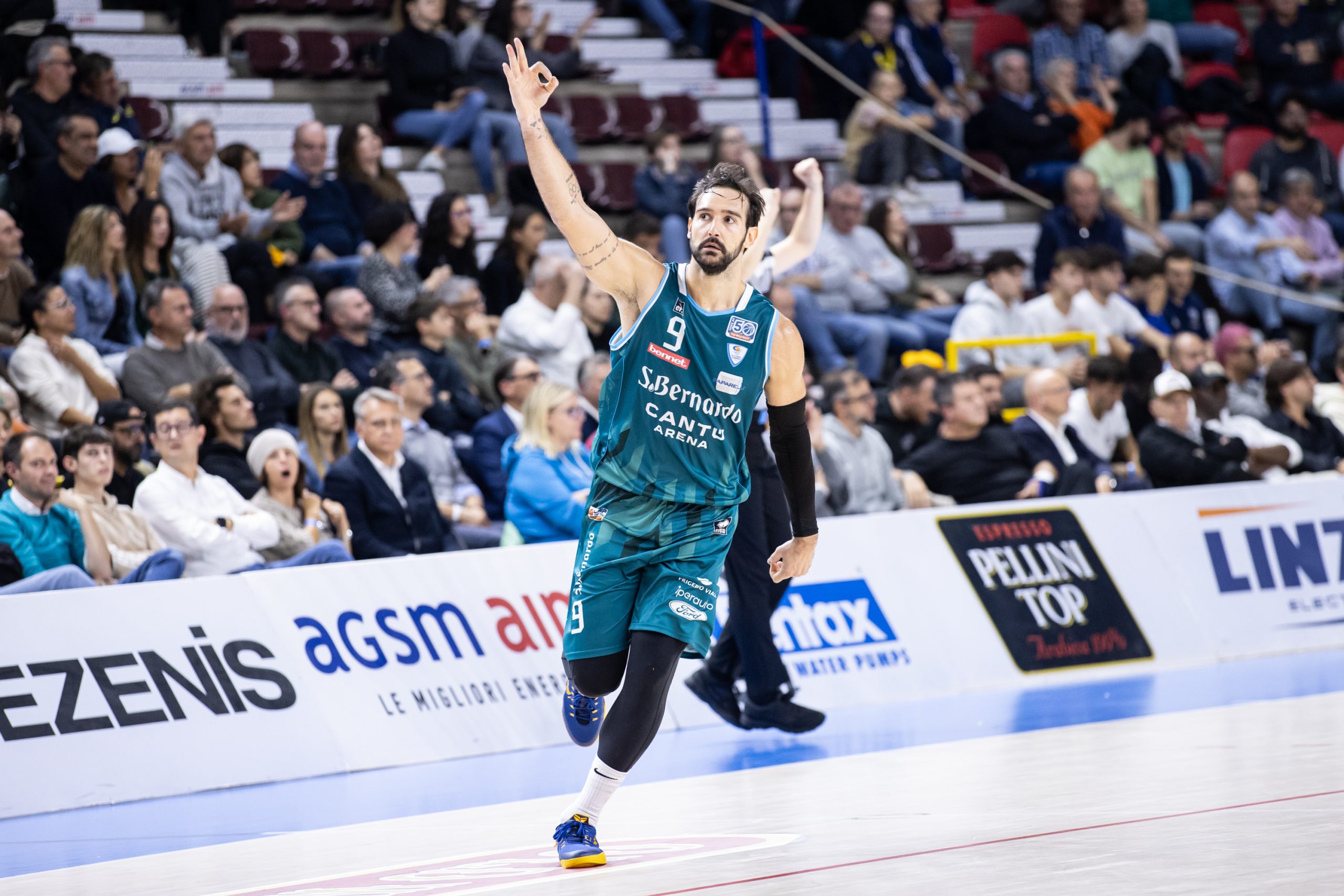 Nel secondo quarto però la Tezenis prende di nuovo il largo, trascinata da un Pullen già in doppia cifra, e tocca le venti lunghezze di vantaggio. Dopo un time-out di Brienza, l’Acqua S.Bernardo riesce a ritrovare armonia e grazie alle triple di McGee e Valentini riduce il gap. Si va all’intervallo lungo con i padroni di casa al comando 49-38.